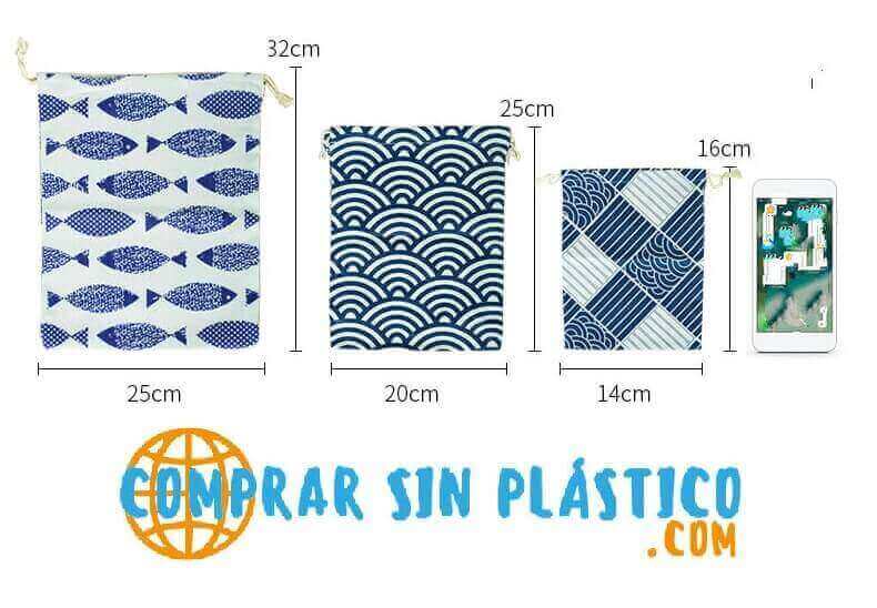 3 Bolsas de ALGODÓN 3 Tamaños, del diseño elegido, en packing reciclable.