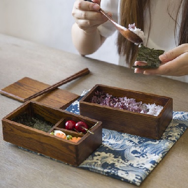 2 fiambreras de madera natural encajables + 1 tapa + 1 separador de alimentos en un packing reciclable.