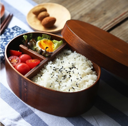 1 x caja fiambrera de MADERA natural + 1 tapa + 1 separador de alimentos en un packing reciclable.